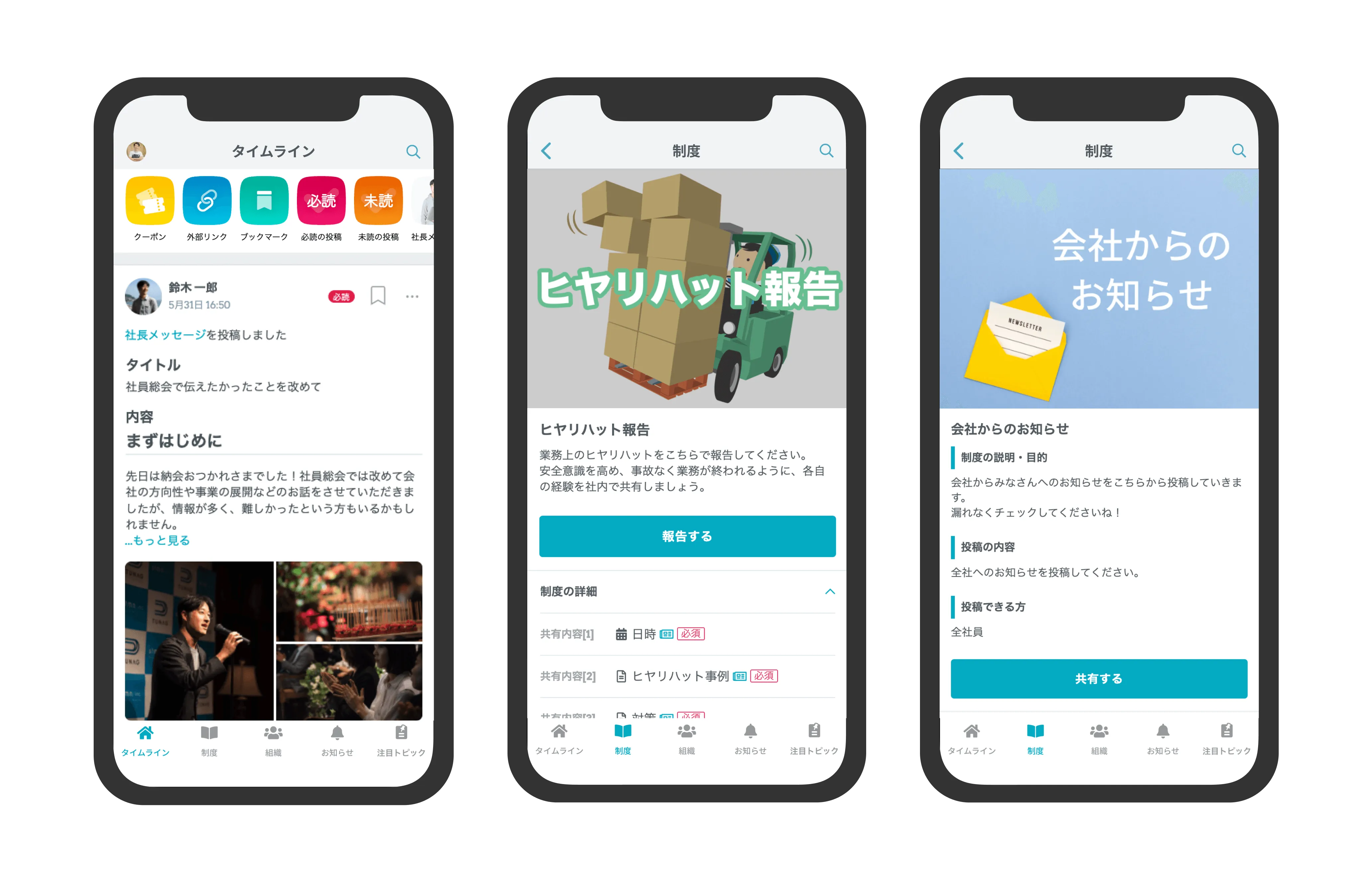 ヒヤリハット報告を継続的に行うためには、報告・共有・周知の流れを仕組みとして運用することが重要です。社内アプリ「TUNAG」を活用すれば、ヒヤリハット報告・共有を自然に組み込むことができます。