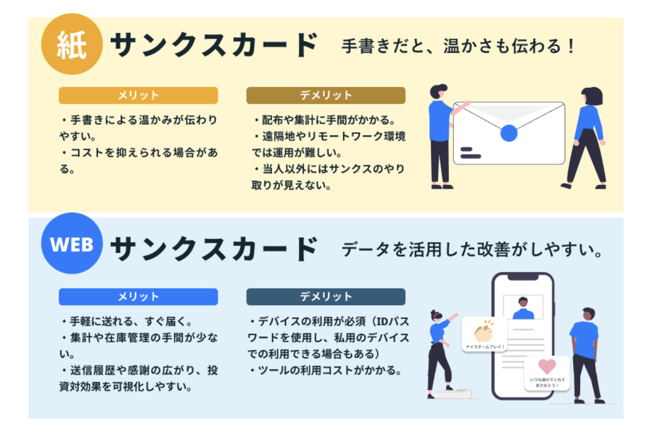 サンクスカードには、物理的な「紙のカード」と、アプリやWebツールで運用する「デジタル版」があります。