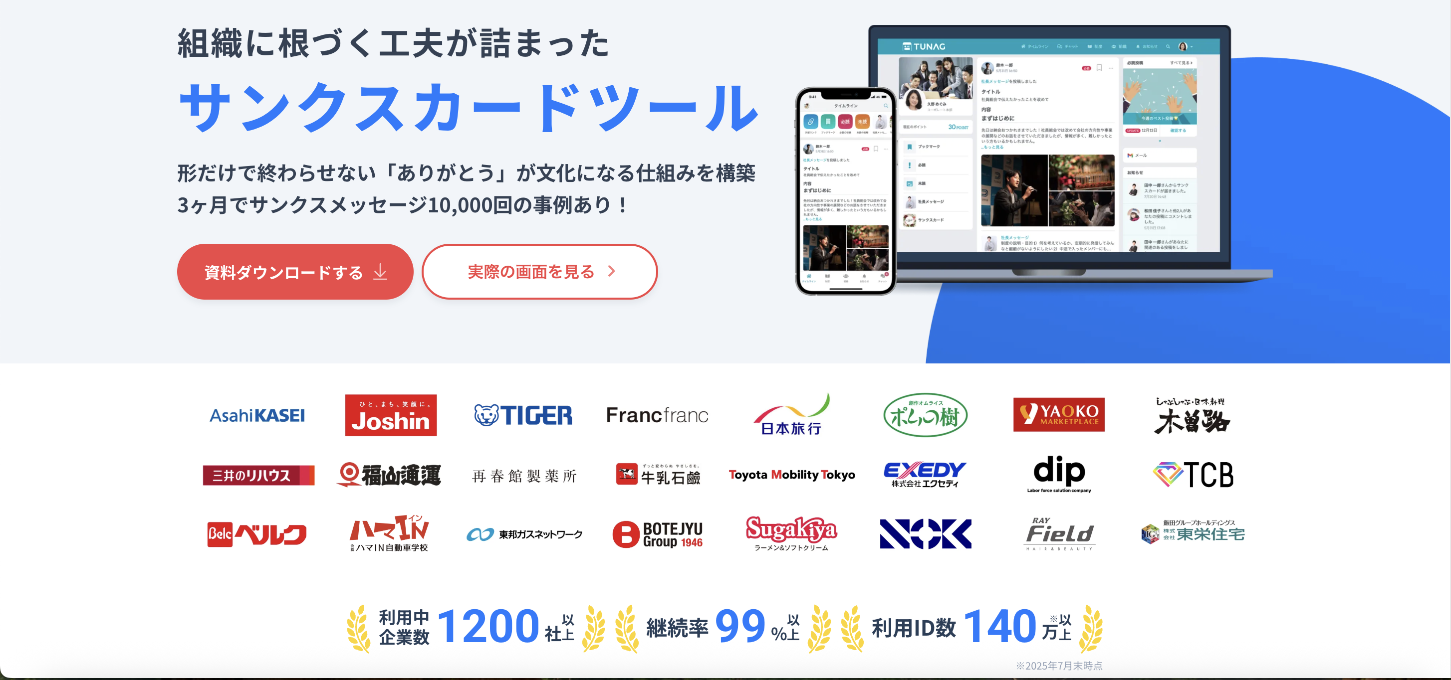TUNAGは、サンクスカードに加えて、従業員エンゲージメントを高める多様な機能を備えた社内情報共有ツールです。基本的なサンクスカード機能に加え、スマホから簡単にカードを送れるため、業態や雇用形態を問わず、誰でも使いやすいことが特徴に挙げられます。