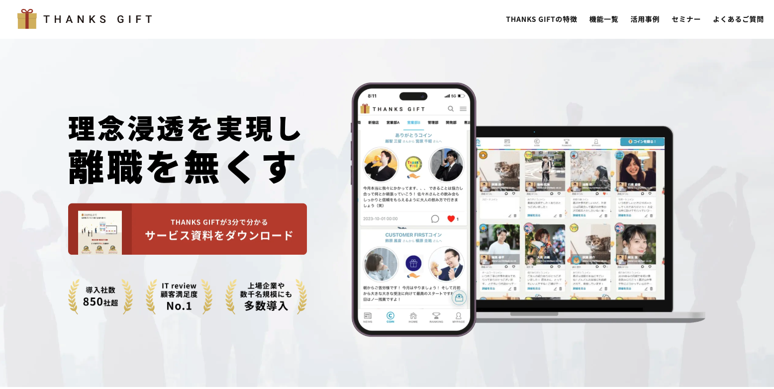 THANKS GIFTは、感謝を贈り合うことで社内コミュニケーションを活性化させ、社内文化を醸成でき組織や社内の生産性向上、エンゲージメント向上を実現するツールです。THANKS GIFTには、日々の感謝を込めてコイン(社内通貨)を送り合える機能が搭載されています。
