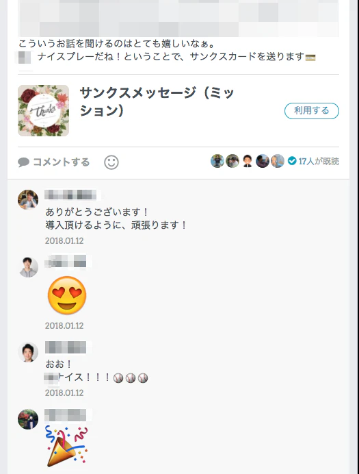 上の画像のように、『TUNAG』ではサンクスカードの内容がタイムラインにシェアされるため、周りの人からのリアクションもつきます。