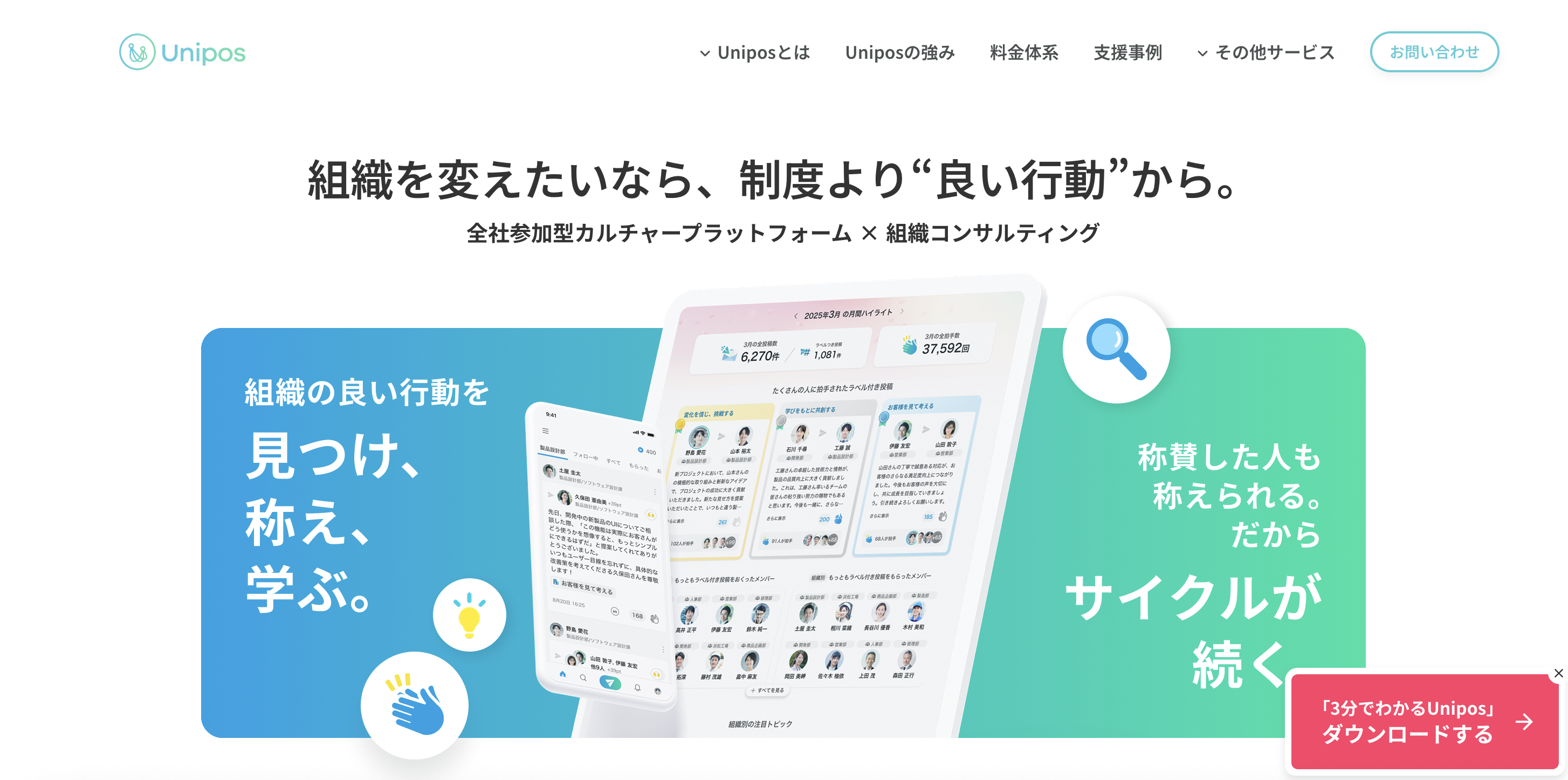 Uniposは、従業員同士で感謝の言葉とともに、少額のインセンティブであるピアボーナス®をWeb上で送りあえるツールです。前者に賞賛が共有される機能や投稿にスタンプで反応できる機能が搭載されています。また、返信機能がないため、返信へのプレッシャーが軽減されます。