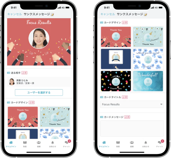 手渡しの紙のカードは、紙のカードは本人同士でしか共有されないため、承認欲求の満たされ方や称賛文化の定着という点では効果が限定されます。アプリであれば、全社員の前で感謝が共有され、組織全体でサンクスカードを贈り合う文化が醸成できます。