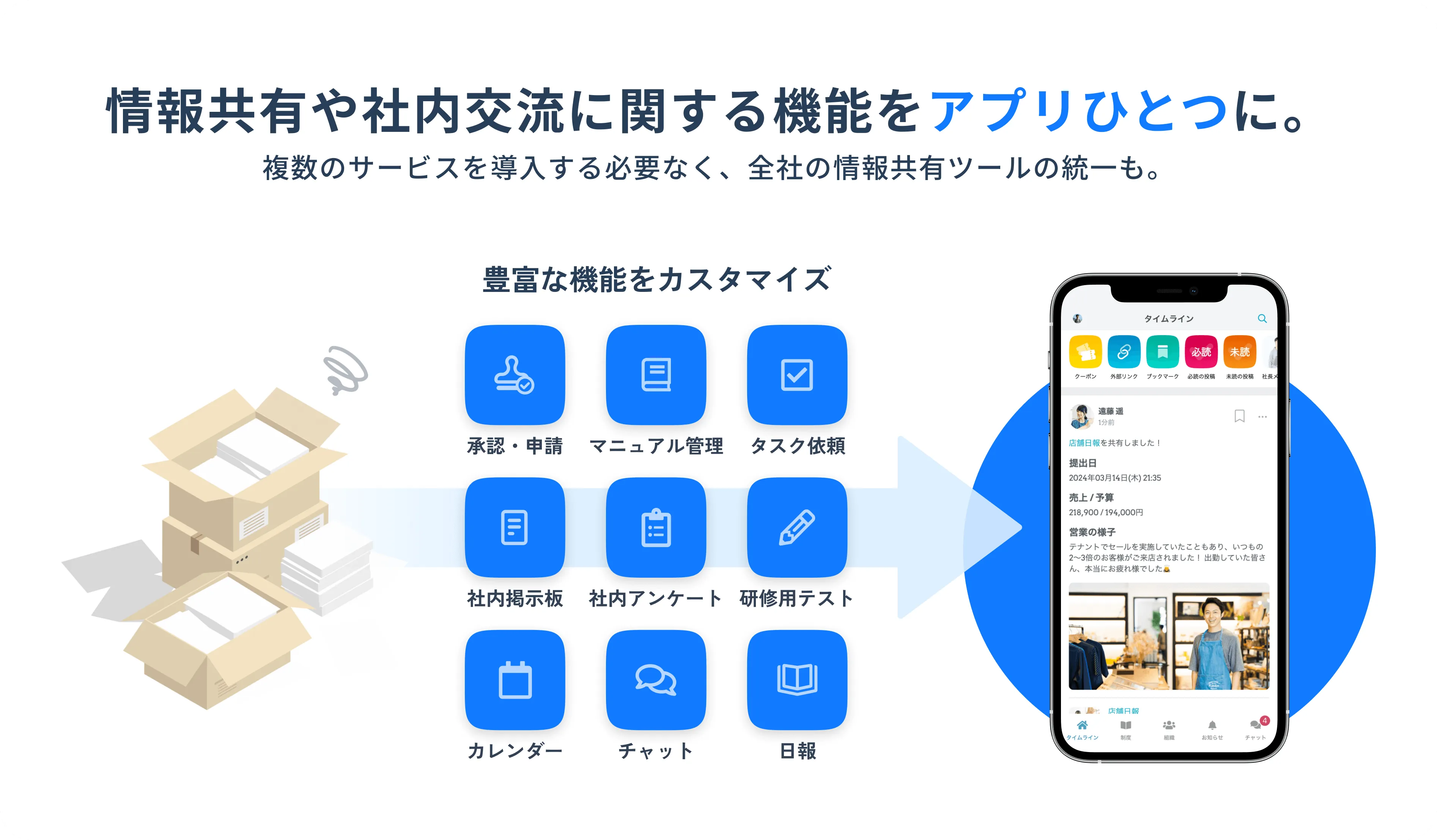 TUNAGは新人教育からペーパーレス化、社内交流活性化まで、各社の組織課題・業務課題に合わせて様々な施策をカスタマイズできるクラウドサービスです。PCだけでなくスマホにも対応しており、社用PCや法人メールアドレスを持たない社員やアルバイトの方にも、迅速かつ正確に情報を届けることが可能です。