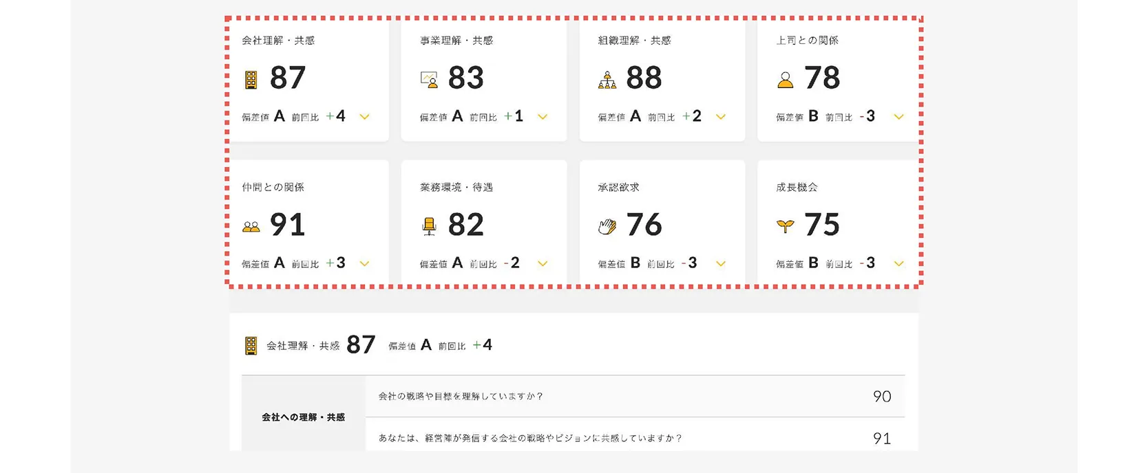 TERASのサンプル画面。8つの項目「会社理解・共感」「事業理解・共感」「相互理解共感」「上司との関係」「仲間との関係」「業務環境・待遇」「承認欲求」「成長機会」がございます。※結果数字は同社の結果ではございません。