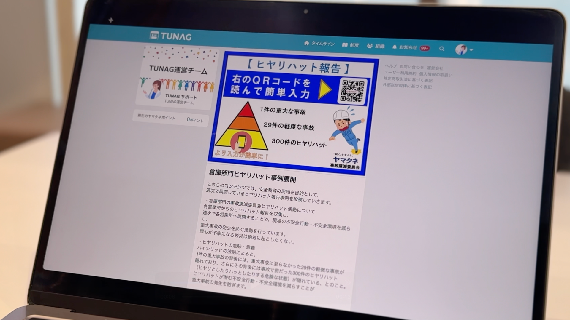 横山:社内コミュニケーションの活性化に加えて、業務改善や安全管理にも大きく貢献しています。例えば、ヒヤリハットの情報共有に関しても、弊社ではTUNAGを活用しています。