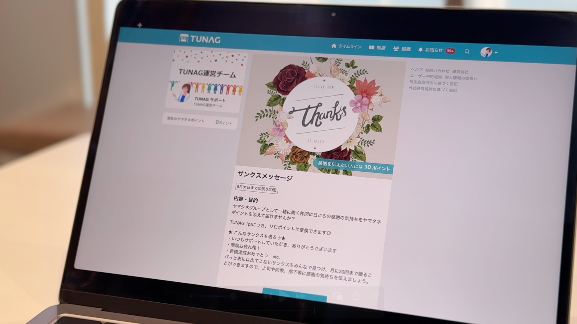 毎週金曜日は「サンクスデー」として、サンクスメッセージの送信を奨励しています。通常、サンクスを受け取った側だけがポイントをもらう仕組みですが、この日は送った側にもポイントがもらえるようにしています。これによって、感謝の気持ちをお互いに送ることが習慣化され、さらに社員同士のつながりが深まったように感じます。