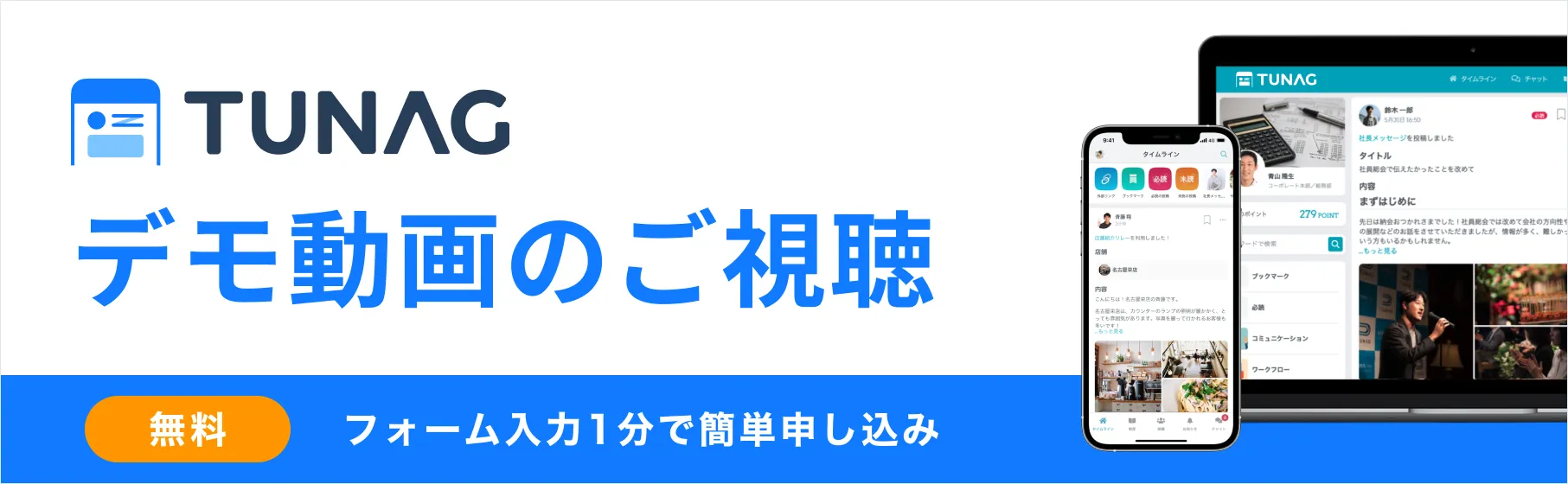 「TUNAGってどんなサービス?」を分かりやすく解説した動画を、お申込みいただいた方だけに限定公開。好きな時間にお気軽にご覧いただけます。働きがいを高めるためのTUNAGのサービス内容をぜひご覧ください。