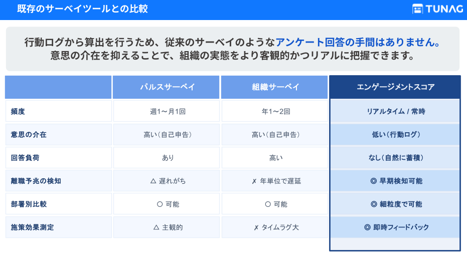 TUNAG(ツナグ)が提供するエンゲージメントスコアは、行動ログデータから個人・部署のエンゲージメント状態を可視化する新しい従業員サーベイです。従来のサーベイのようなアンケート回答の手間はなく、回答時の「意思の介在」を抑えることで、コンディションをより客観的かつリアルに分析できます。