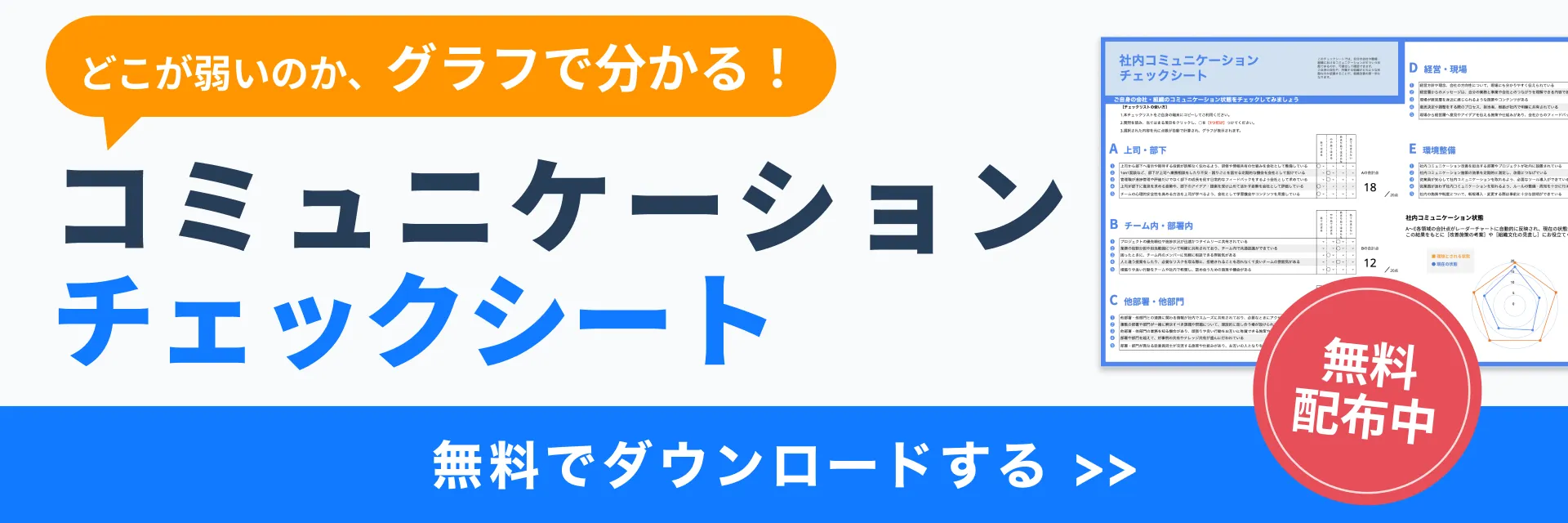 本資料は、簡単な質問に答えるだけで社内コミュニケーションの弱点がグラフで分かるチェックシートです。ぜひダウンロードして、漠然とした課題から「具体的な改善点」を見つけましょう。