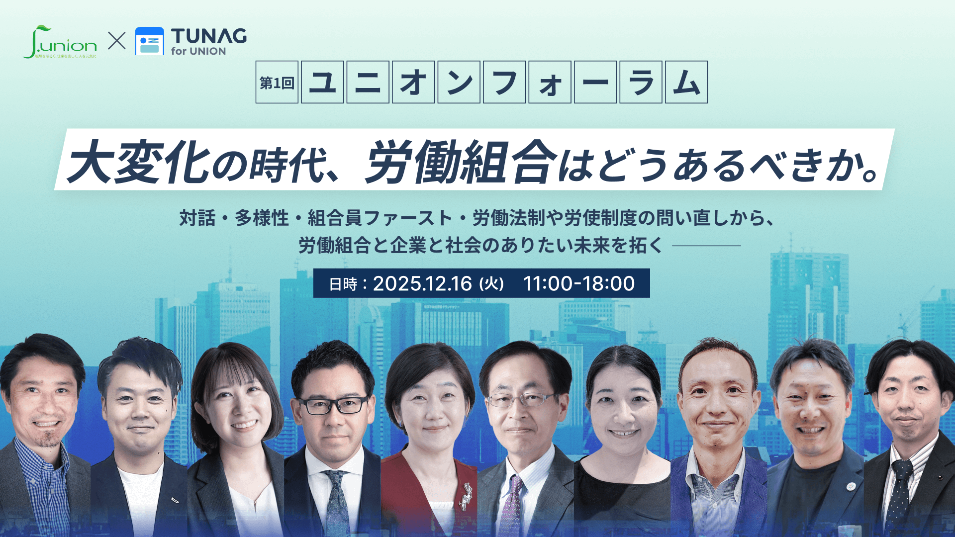 「TUNAG for UNION(ツナグ フォー ユニオン、https://biz.tunag.jp/lp/union)」と、労働組合専門のコンサルティング会社であるj.union株式会社(本社:東京都新宿区、代表取締役社長:服部 恵祐、以下j.union)は、労働組合領域における価値提供の強化を目的とした協業を開始後の取り組みとして、第1回ユニオンフォーラム(j.union × TUNAG for UNION)を開催いたします。
