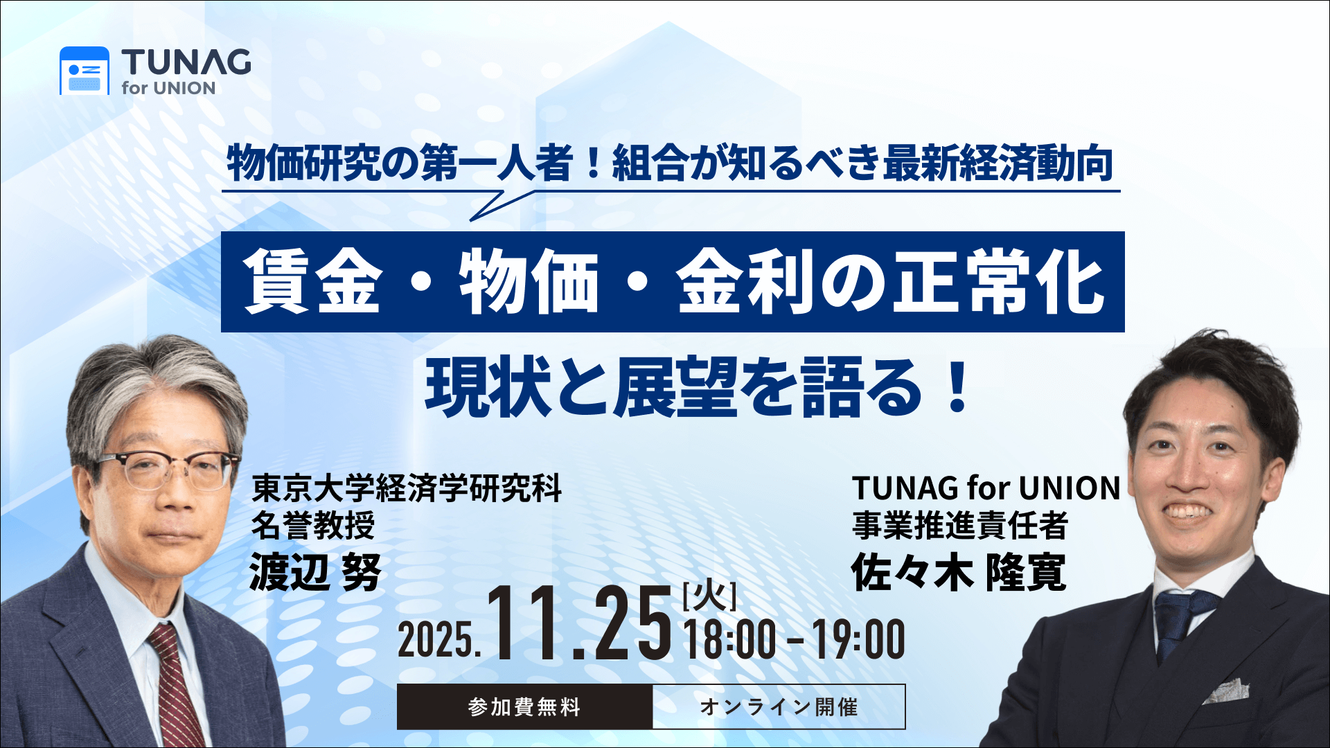 「TUNAG for UNION(ツナグ フォー ユニオン、https://biz.tunag.jp/lp/union)」は、東京大学経済学研究科名誉教授、渡辺努氏と、2025/11/25(火)18:00〜19:00に参加無料のオンラインセミナーを開催いたします。