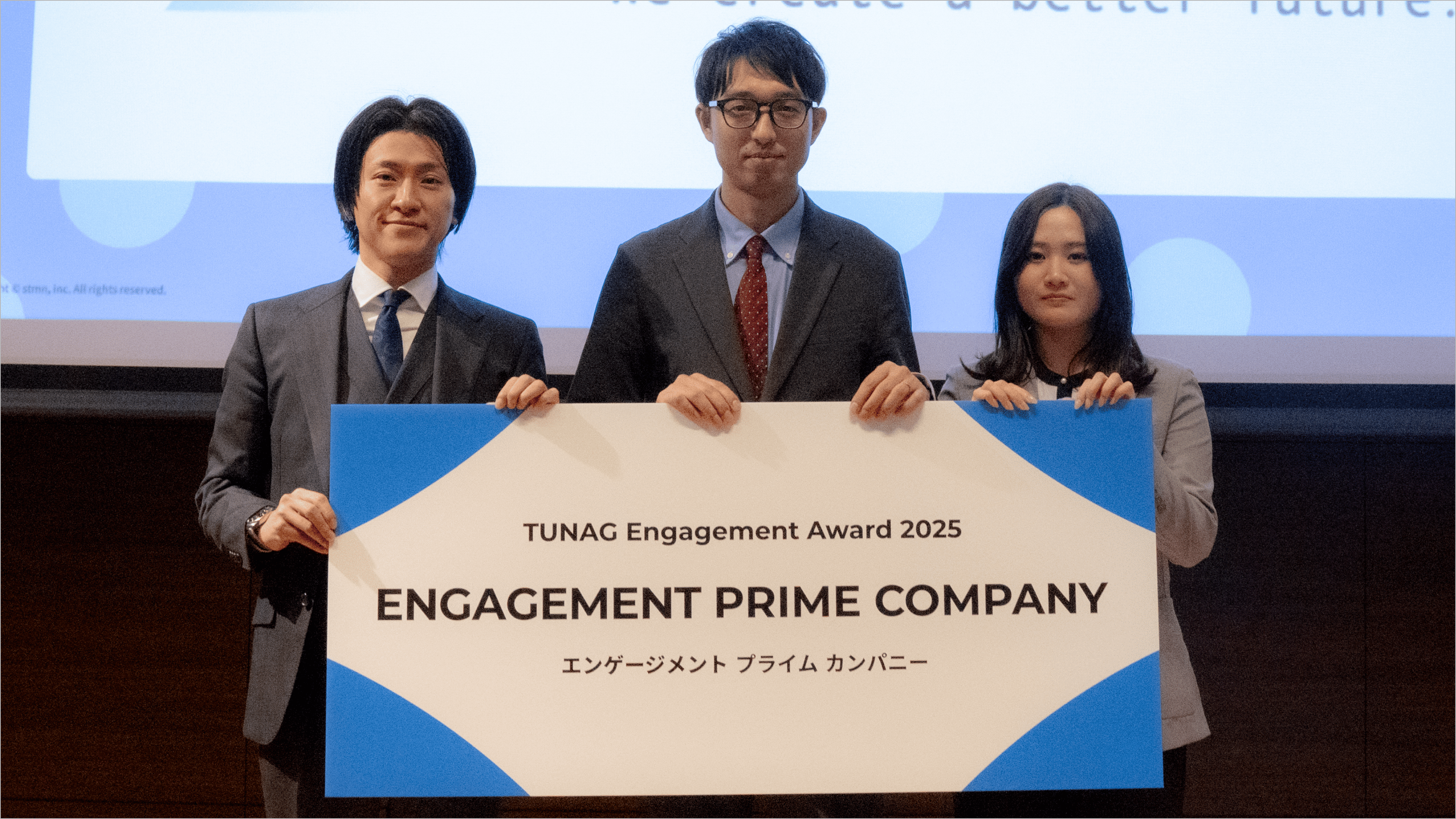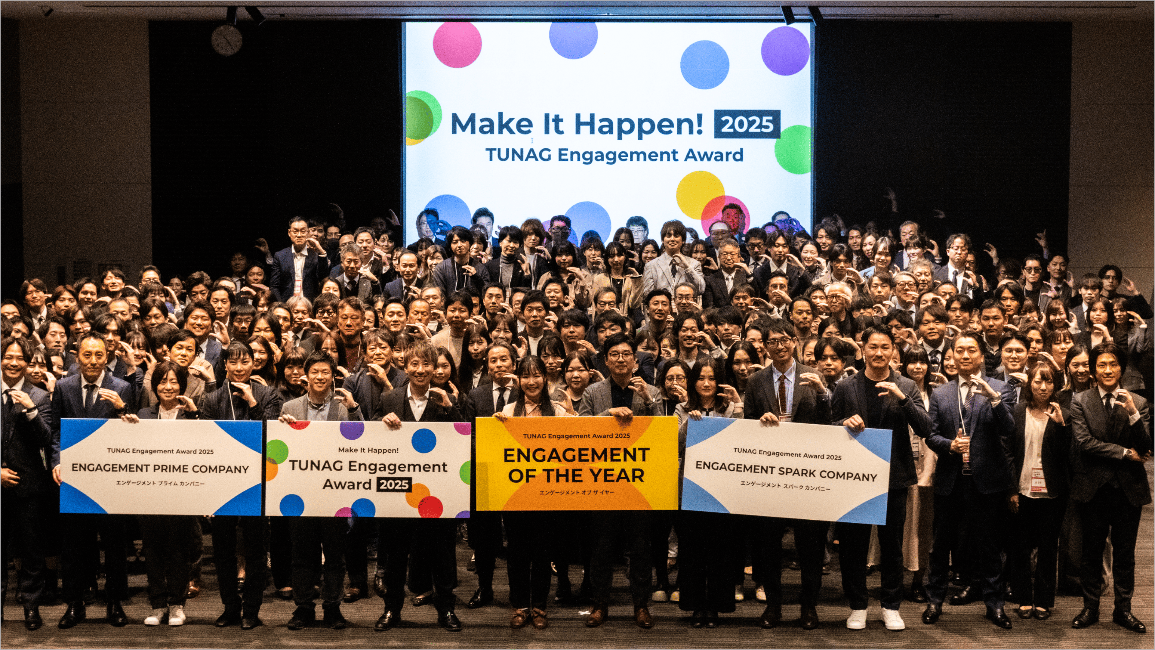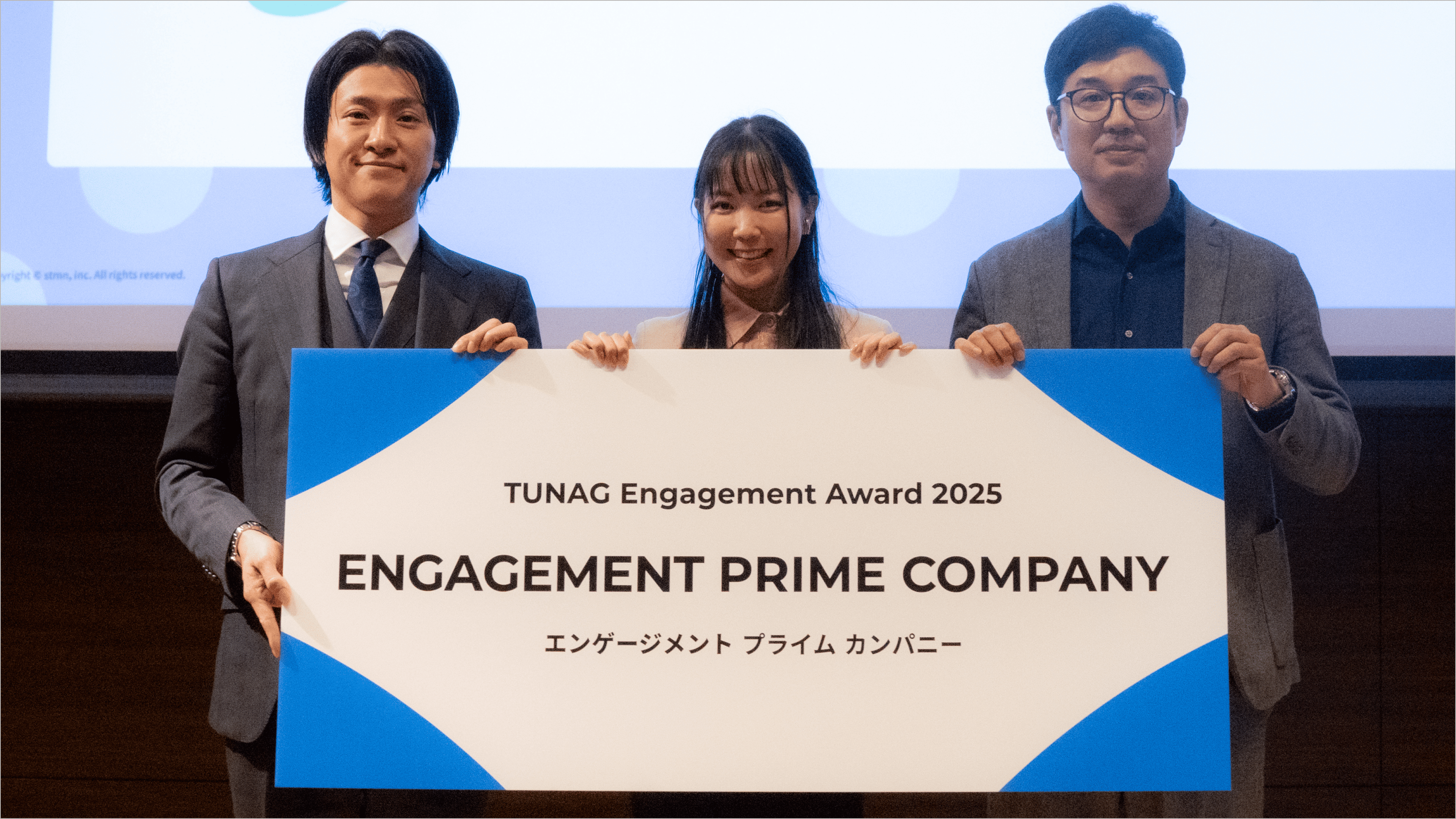 本アワードでは、「変化の連鎖」をテーマに、TUNAGを通じて組織改善に取り組んだ企業のエピソードを公募しました。その中から、優れた成果を上げた5社を「ENGAGEMENT PRIME COMPANY」として表彰し、さらにその中でも最も大きな成果を創出した1社を「ENGAGEMENT OF THE YEAR」として選出しました。